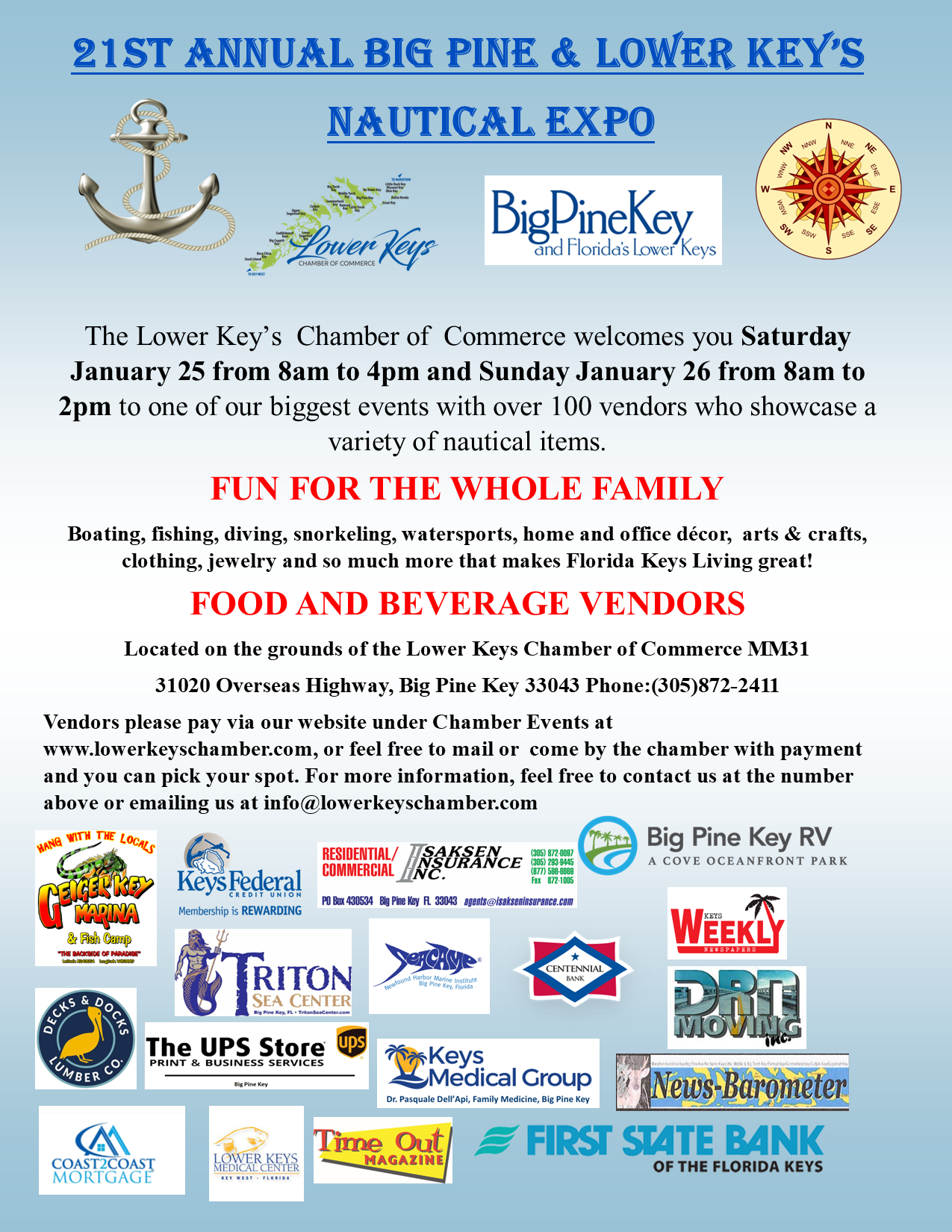 The Annual Big Pine & Lower Keys Nautical Expo will be held on Saturday & Sunday, in January of 2025, dates coming soon,  on the Chamber grounds at 31020 Overseas Highway, MM 31 on Big Pine Key from 8am-4pm on Saturday and Sunday from 8am-2pm. Set up begins Friday morning at 8am. All vehicles must be off the lot Saturday by 7am. Call the Chamber for more information at (305) 872-2411.