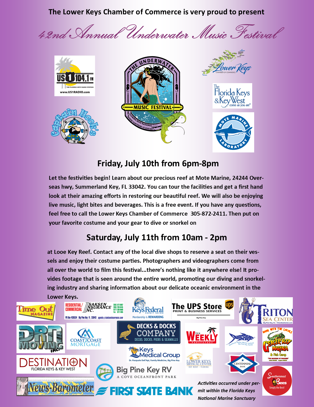 Everyone is invited to join the Lower Keys Chamber of Commerce for the Chambers Annual Underwater Music Festival.  This is a free event.  If you wish to sponsor the event you can call the Chamber.